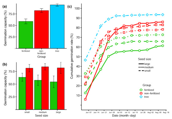- Murali, K.S. Patterns of seed size, germination and seed viability of tropical tree species in Southern India. Biotropica 1997, 29, 271–279. [Google Scholar] [CrossRef]