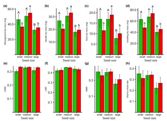 - Poorter, L.; Rose, S.A. Light-dependent changes in the relationship between seed mass and seedling traits: A meta-analysis for rain forest tree species. Oecologia 2005, 142, 378–387. [Google Scholar] [CrossRef]