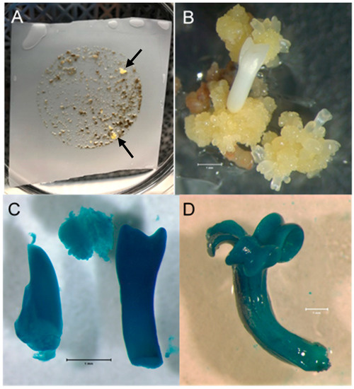 - Vidal, N.; Mallon, R.; Valladares, S.; Meijomin, A.M.; Vieitez, A.M. Regeneration of transgenic plants by Agrobacterium-mediated transformation of somatic embryos of juvenile and mature Quercus robur. Plant Cell Rep. 2010, 29, 1411–1422. [Google Scholar] [CrossRef]