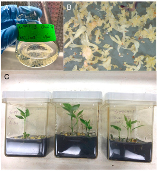 The Agrobacterium tumefaciens (Agro) strain AGL1 harboring the pFHI-GUSi binary vector [42] was used for all ash transformation experiments. The pFHI-GUSi binary vector carries the nptII gene and the intron version of the β-glucuronidase gene (intron-GUS), which prevents bacterial expression of the enzyme. Two days prior to co-cultivation with the plant cells, the Agro with pFHI-GUSi plasmid was grown on semi-solid YEP medium supplemented with 50 mg/L rifampicin, 100 mg/L kanamycin, and 100 mg/L carbenicillin. A single colony from the semi-solid medium was chosen and used to inoculate 25 mL of liquid YEP medium using the same antibiotics. The Agro culture was then grown overnight in the dark at 28 °C on a rotary shaker set at 200 rpm. From this overnight Agro culture, a new culture was initiated by adding 50 µL of this culture to a new flask containing 25 mL of liquid YEP supplemented with the aforementioned antibiotics and grown under the same conditions as the previous Agro cultures. On the day of Agro co-cultivation with the plant cells, the desired optical density (OD600) of the Agro culture was between 0.600–0.700. The Agro cells were collected in 50 mL conical tubes and centrifuged at 4100 rpm for 15 min at 25 °C. Then, the supernatant was poured off and the pellet was resuspended in 25 mL of Agro induction medium (AIM), which contained AB medium [47] with 250 mM acetosyringone for induction of the virulence genes. The Agro cells were placed in the dark on a rocker set at 225 rpm for 1–2 h prior to being used for co-cultivation.