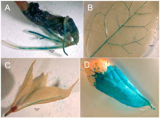 - Jefferson, R.A. Assaying chimeric genes in plants: The GUS gene fusion system. Plant Mol. Biol. Report. 1987, 5, 387–405. [Google Scholar] [CrossRef]