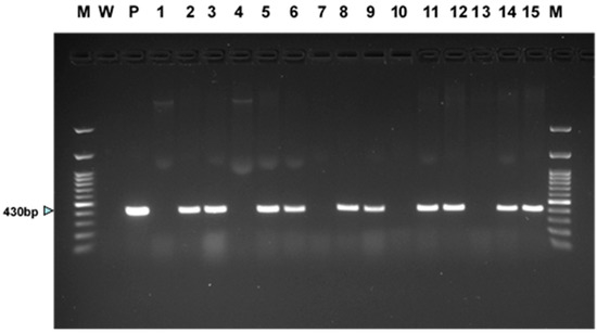 PCR results for presence of GUSi gene in tissues derived from two independent transgenic events for each of the two white ash genotypes (LA112-10, LA115-5) and three green ash genotypes (5-FP-1, 5-FP-2, 5-FP-4). DNA of transgenic and wildtype control somatic seedlings was extracted from leaf tissue, except for DNA of wildtype 5-FP-2, which was extracted from embryogenic tissue. Lanes are as follows: (M) 100 bp molecular weight ladder, (W) no DNA control, (P) GUSi plasmid, (1) LA112-10 wildtype, (2) LA112-10-8 GUSi, (3) LA112-10-9 GUSi; (4) LA115-5 wildtype, (5) LA115-5-1 GUSi, (6) LA115-5-3 GUSi, (7) 5-FP-1 wildtype, (8) 5-FP-1-1 GUSi, (9) 5-FP-1-3 GUSi, (10) 5-FP-2 wildtype, (11) 5-FP-2-4 GUSi, (12) 5-FP-2-5 GUSi, (13) 5-FP-4 wildtype, (14) 5-FP-4-2 GUSi, (15) 5-FP-4-5 GUSi, and (M) 100 bp molecular weight ladder.