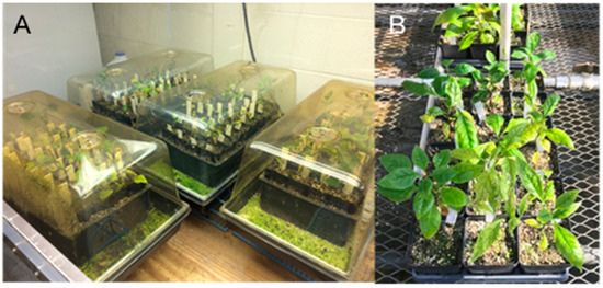 Transgenic green ash and white ash somatic seedlings following transfer from in vitro conditions. (A). Transgenic ash somatic seedlings following transfer to potting mix in domed trays for acclimatization. (B). Acclimatized transgenic ash somatic seedlings in the greenhouse.