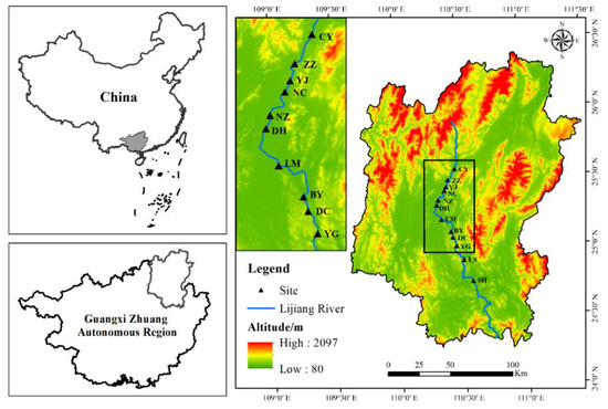 Our study area is located in the Lijiang River Basin in the northeast of Guangxi Zhuang Autonomous Region, China. It is in the upper reaches of the Guijiang River, covering a length of approximately 164 km, with an average elevation of 158 m, as a primary tributary of the Xijiang River in the Pearl River Basin. The geographic coordinates are 24°18′–25°41′ N, 109°45′–110°40′ E. It has been listed as a World Natural Heritage Site since 2014 and is a popular tourist destination deriving from its unique karstic landscape. The karst landform is a rare geomorphological type with fragile ecosystems that are slow to recover after disturbance [22]. In recent years, excessive tourism-related development and other anthropogenic disturbances have interacted to influence the highly variable and complex Lijiang River Basin system. The area is in the humid monsoon climate zone within the mid-subtropical zone, with a mild climate and four distinct seasons. Annual rainfall is abundant but extremely uneven during the year. The flood season occurs from March to August, and the dry season occurs from September to February. The annual average temperature is 18–19 °C, the coldest January average temperature is about 8–9 °C and the hottest August average temperature is about 28 °C. Rainfall is concentrated in the warm season. The annual rainfall is 1814–1941 mm, the annual evaporation is 1377–1857 mm and the annual average relative humidity is 73%–79%. The year-round sunshine is sufficient, and the annual average sunshine time is 1670 h. Soil type is dominated by red loam and has the features of high coarse texture, gravel-type substrates, shallow soil layer and unevenly distributed soil layer thickness [19,21] for years of continuous erosion and deposition by river water. Common woody plant in the riparian zone of the Lijiang River Basin includes Pterocarya stenoptera C. DC., Triadica sebifera (L.) Small, Celtis sinensis Pers., Cinnamomum burmannii (Nees & T. Nees) Blume, Cinnamomum camphora (L.) J. Presl, Ficus abeli Miq., Vitex negundo var. cannabifolia (Sieb.et Zucc.) Hand.-Mazz., Flueggea virosa (Roxb. ex Willd.) Royle, Rauvolfia verticillat (Lour.) Baill., Adina rubella Hance and so on.