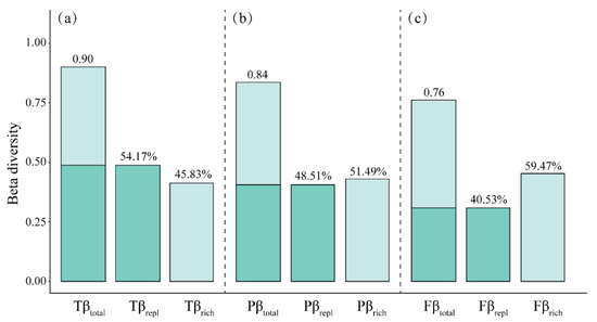 Beta diversity with its two components along the riparian zone of the Lijiang. (a) Mean taxonomic beta diversity, (b) mean phylogenetic beta diversity, (c) mean functional beta diversity. The percentages in the figure represent relative proportion of replacement and richness components, respectively. Tβtotal represents total taxonomic beta diversity; Tβrepel represents the sum of replacement components on taxonomic beta diversity; Tβrich represents the sum of richness components on taxonomic beta diversity. Pβtotal represents total phylogenetic beta diversity; Pβrepel represents the sum of replacement components on phylogenetic beta diversity; Pβrich represents the sum of richness components on phylogenetic beta diversity. Fβtotal represents total functional beta diversity; Fβrepel represents the sum of replacement components on functional beta diversity; Fβrich represents the sum of richness components on functional beta diversity.