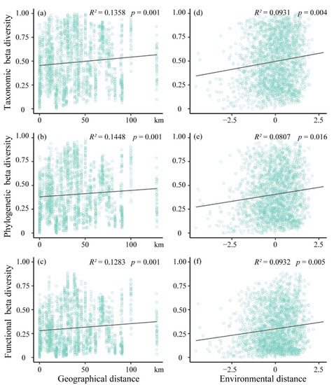 Variance in beta diversity along the geographic distance and environmental distances. (a) Variance in taxonomic beta diversity along the geographic distance, (b) variance in phylogenetic beta diversity along the geographic distance, (c) variance in functional beta diversity along the geographic distance, (d) variance in taxonomic beta diversity along the environmental distances, (e) variance in phylogenetic beta diversity along the environmental distances, (f) variance in functional beta diversity along the environmental distances. R2—13.58% of variability is explained by geographic distance of taxonomic diversity, 9.31% of variability is explained by environmental distance of taxonomic diversity, 14.48% of variability is explained by geographic distance of phylogenetic diversity, 8.07% of variability is explained by environmental distance of phylogenetic diversity, 12.83% of variability is explained by geographic distance of functional diversity, 9.32% of variability is explained by environmental distance of functional diversity. p-values represent the significance of the statistical results.