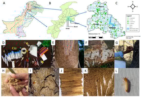 Collection of termites from the studied area during 2016–19. (A = Map of Pakistan*; B = Map of Khyber Pakhtunkhwa; C = Collection map of Genus Odontotermes; D = Material used; E = Termites feeding on Acacia spp. stem; F = On spot termites collection from fallen tree trunk; G = On spot termites collection by breaking galleries on standing tree; H = Breaking mud for on spot collection; I = On spot termites collection from animal dung; J = Carton used as a modified NIFA Termap; K = Separation of culture from installed NIFA Termap; L = Soldier from collection for storage (* = retrieved from http://surveyofpakistan.gov.pk/; accessed on 15 January 2020).