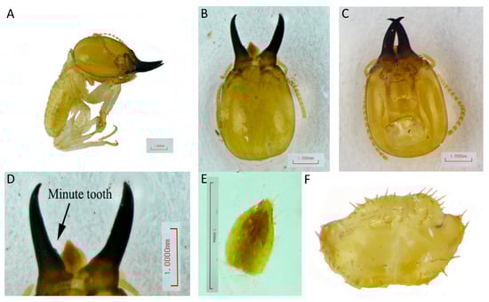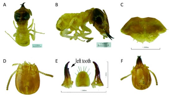 (A–F). Various identifying characters of the O. parvidens soldier caste. (A = Side view of the soldier, B = Dorsal view of head of the soldier, C = Postmentum, D = Dorsal view of mandibles, E = Dorsal view of labrum, F = Dorsal view of pronotum).