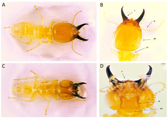 (A–D). Identifying characters of the O. horai soldier caste. (A). Dorsal view of the soldier, (B). Dorsal view of head portion of the soldier (I = mandibles with tooth; II = antenna; III = head capsule; IV = pronotum); (C). Ventral view of the soldier, (D). I = Labrum; II and III = Postmentum.