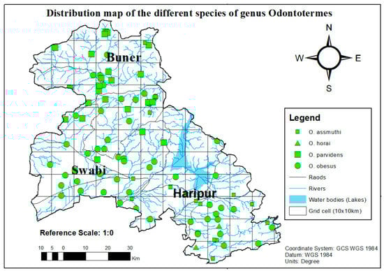 Considering the geological history, diverse latitude, and high-altitude ranges, Pakistan is a diverse ecological region for fauna and flora. Recently, [] studied termites in Pakistan, focusing on some of the regions of Khyber Pakhtunkhwa (KP) (previously known as NWFP), and reported economic losses in some of the regions of the province []. However, the area with the districts Buner, Swabi, and Haripur (oriental region) unexplored. Iqbal et al. [] reported that 11 out of 53 species are causing damages in Pakistan by species primarily belonging to the families Rhinotermitidae and Termitidae. Termitidae of the oriental region is well studied by [], and the genus Odontotermes is one of the most abundant and diverse genera, responsible for forest, agricultural, and structural damage in various agro-ecological zones []. However, the abundance and diversity of the genus are unknown in Buner, Swabi, and Haripur.