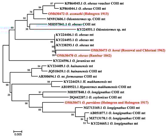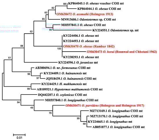 The following are available online at https://www.mdpi.com/article/10.3390/f13050674/s1, Figure S1: Alignment of the O. parvidens (sbjct) with the NC_034130.1 (Query) (NCBI curated refseq of O. longignathus) for checking the species identification validity, Figure S2: Alignment of the MH557840.1 (sbjct) with the NC_034130.1 (Query) (NCBI curated refseq of O. longignathus) for checking the species identification validity, Figure S3: Alignment of the O. assmuthi (sbjct) with the NC_034027.1 (Query) (NCBI curated refseq of O. obesus) for checking the species identification validity, Figure S4: Alignment of the KP864045.1 (O. obesus) (sbjct) with the NC_034027.1 (Query) (NCBI curated refseq of O. obesus) for checking the accession validity, Figure S5: Alignment of the KP864044.1 (O. obesus) (sbjct) with the NC_034027.1 (Query) (NCBI curated refseq of O. obesus) for checking the accession validity, Figure S6: Alignment of the MN913606.1 (Odontotermes sp.) (sbjct) with the NC_034027.1 (Query) (NCBI curated refseq of O. obesus) for checking the accession validity, Figure S7: Alignment of the MH557841.1 (O. obesus) (sbjct) with the NC_034027.1 (Query) (NCBI curated refseq of O. obesus) for checking the accession validity, Figure S8: Alignment of the O. obesus (sbjct) with the NC_034027.1 (Query) (NCBI curated refseq of O. obesus) for checking the species identification validity, Figure S9: Alignment of the O. horai (sbjct) with the NC_034027.1 (Query) (NCBI curated refseq of O. obesus) for checking the species identification validity, Table S1: Measurements of various taxonomic characters and indices for O. parvidens of district Buner during, 2016–19, Table S2: Measurements of various taxonomic characters and indices for O. parvidens of district Swabi during, 2016–19, Table S3: Measurements of various taxonomic characters and indices for O. obesus of district Buner during, 2016–19, Table S4: Measurements of various taxonomic characters and indices for O. obesus of district Haripur during, 2016–19, Table S5: Measurements of various taxonomic characters and indices for O. obesus of district Swabi during, 2016–19, Table S6: Measurements of various taxonomic characters and indices for O. horai of district Haripur during, 2016–19, Table S7: Measurements of various taxonomic characters and indices for O. assmuthi of district Buner during, 2016–19, Table S8: Measurements of various taxonomic characters and indices for O. assmuthi of district Haripur during, 2016–19, Table S9: Measurements of various taxonomic characters and indices for O. assmuthi of district Swabi during, 2016–19, Table S10: Material examined for the morphometric analysis of O. parvidens from the studied area during, 2016–19, Table S11: Material examined for the morphometric analysis of O. assmuthi from the studied area during, 2016–19, Table S12: Material examined for the morphometric analysis of O. obesus from the studied area during, 2016–19, Table S13: Material examined for the morphometric analysis of O. horai from the studied area during, 2016–19.
