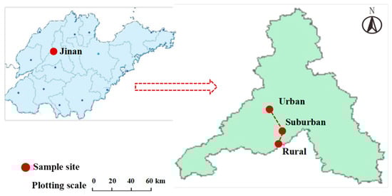 Jinan city, the capital of Shandong Province, is located between 34°46′–37°32′ N and 116°13′–117°58′ E, in the middle and lower reaches of the Yellow River. The terrain in the south is higher than that in the north in this area. Jinan has a typical temperate monsoon climate characterized by distinct seasons, a mean annual temperature of 13.8 °C and mean precipitation of 650–700 mm. Jinan city has abundant forest resources, dominated by Quercus acutissima, Platycladus orientalis, Robinia pseudoacacia and Pinus thunbergii Parl [24]. The urbanization level in Jinan reached 73.46% as of 2021 [25]. The typical urban areas, ecologically sensitive areas and southern mountain control areas were designed in Jinan along with the development of the economy. Here, we focused on the Quercus acutissima forest, which is a typical type of vegetation in Jinan. The study areas were Quancheng Park (36°38′ N, 117°38′ E) in the urban area, Liubu Forest Farm (36°27′ N, 117°11′ E) in the suburbs and Yaoxiang Forest Park (36°12′ N, 117°4′ E) in the countryside. The geographic information for the study areas is shown in Figure 1.