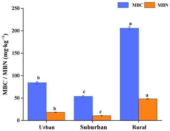 MBC and MBN contents in Quercus acutissima forest soil along the urban–rural gradient. Different letters in each column indicate significant differences in soil samples (p < 0.05).