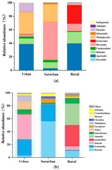The relative abundance of ECM fungi at the order (a) and genus (b) levels in the soil of Quercus acutissima forests along the urban–rural gradient.