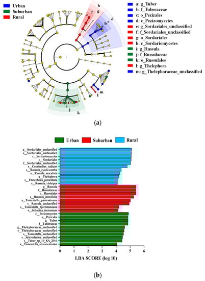 Cladogram (a) and LDA distribution histogram (b) for ECM fungi in the soil of Quercus acutissima forests along the urban–rural gradient.