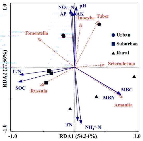 Redundancy analysis confirmed that soil physicochemical properties had the greatest effect on dominant ECM fungi at the genus level (top six relative abundances) (Figure 5). The first axis and second axis explain the variations of 54.34% and 27.56%, respectively. The dominant Russula exhibited a strongly positive relationship with SOC and C/N, while Scleroderma was negatively correlated with SOC and C/N, indicating that soil carbon could drive much more variation in Russula and Scleroderma. Inocybe and Tuber showed a remarkably positive relationship with NO3−-N, AK, AP and pH, but a strongly negative relationship with NH4+-N and TN. In addition, Tomentella weakly positively correlated with SOC, NO3−-N, AK and AP. Amanita significantly positively correlated with MBC and MBN, but weakly related with NH4+-N and TN. The three sampling sites for urban, suburban and rural forests were distributed in different quadrants, and the three sampling plots in the same area showed obvious clustering phenomena, implying that the ECM fungal community composition differed significantly in the Quercus acutissima forests along the urban–rural gradient (Figure 3).