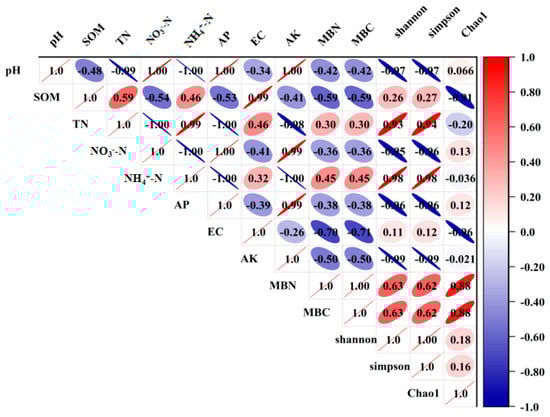 Pearson correlation heat map of soil physicochemical properties and ECM fungal diversity. Red is positive, blue is negative; the darker color means the correlation is stronger.