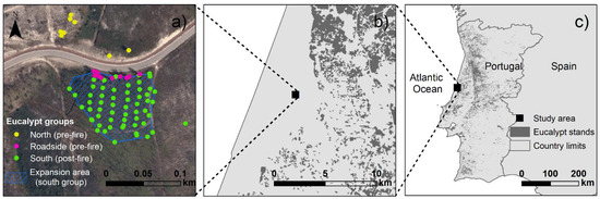 Location of sampled eucalypts (n = 78) in the study area according to eucalypt groups (a), relative to surrounding eucalypt stands (b), in central Portugal (c). Eucalypt groups include: “north”—pre-fire eucalypts established north of the road; “south”—post-fire eucalypts established south of the road; roadside—large pre-fire eucalypts established on the roadside. Geographical information (orthophoto 2018) in (a) provided by Direção-Geral do Território.