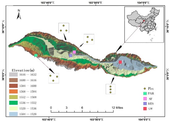 Distribution of sampling sites and plots in built-up area of Lanzhou city.