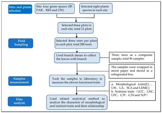 In September 2020, to minimize errors owing to the diurnal variation of specific leaf areas between morning and afternoon [42], the leaves were collected from 8:30~11:00. Twenty gram samples were taken from each tree (5 g from the four different azimuth orientations) in the upper third of the crown (current-year leaves were sampled for evergreen species). Branch shears were used to collect the leaves and all samples were taken with branches [15]. The leaves were wrapped in moist paper and placed in sealed polyethylene bags. All samples were stored in a refrigerated box during transport to the laboratory. Samples over 24 h were held at 2~6 °C [42]. Figure 2 showed the whole process of the experiment.