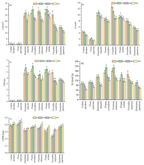 As shown in Figure 3, except for P. asperata, LA, LL, LW, and SLA of C. deodara, E. maackii, P. cerasifera, F. chinensis, P. triloba, F. suspensa, and E. japonicus in SF and PAR were higher than those in RES and GW. In contrast, LDMC of all plants in RES and GW was higher than those in SF and PAR. LA of C. deodara and F. suspensa was the highest in SF, and significantly different from PAR, RES, and GW (p < 0.05). LA of P. asperata and P. cerasifera was the highest in PAR, and significantly different from SF, RES, and GW (p < 0.05). LL of C. deodara, F. chinensis, F. suspensa, and E. japonicus was the highest in SF, and not significantly different from those in PAR, but significantly different from those in RES and GW (p < 0.05). In PAR, LL of E. maackii, P. cerasifera, and P. triloba were significantly higher than those in RES and GW (p < 0.05), but not significantly different from SF (p > 0.05). LL of P. asperata in PAR was significantly different among SF, RES, and GW. With the exception of C. deodara and F. suspensa, LW of P. asperata, E. maackii, P. cerasifera, F. chinensis, P. triloba, and E. japonicus was the highest in PAR, and LW of P. asperata, E. maackii, and P. cerasifera in PAR was significantly different from SF, RES, and GW (p < 0.05). In PAR, the SLA of P. cerasifera, F. chinensis, P. triloba, and F. suspensa was significantly higher than SF, RES, and GW (p < 0.05). In GW, LDMC of C. deodara, P. asperata, E. maackii, P. cerasifera, F. chinensis, P. triloba, F. suspensa, and E. japonicus was the highest. LDMC of P. asperata, E. maackii, and F. suspensa in GW was not significantly different from RES, but was significantly different from SF and PAR (p < 0.05).