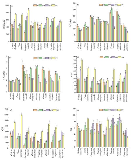 As shown in Figure 4, the LCC of eight plants in GW was the highest. LCC of C. deodara and E. maackii was significantly different among four green spaces (p < 0.05). LNC of C. deodara, F. suspensa, and E. japonicus in SF was significantly higher than that of PAR, RES, and GW (p < 0.05). LNC of E. maackii in SF was not significantly higher than that of RAR and RES (p > 0.05), but significantly higher than GW (p < 0.05). LNC of P. asperata and P. triloba in PAR was the highest and was significantly different from SF, RES, and GW (p < 0.05). LNC of P. cerasifera and F. chinensis was significantly higher than GW (p < 0.05) but not significantly different from SF and RES (p > 0.05). In SF, PAR, and RES, LPCs of C. deodara and P. asperata were not significantly different from each other (p > 0.05) but were significantly higher than GW (p < 0.05). LPC of E. maackii, F. chinensis, P. triloba, and E. japonicus in SF and PAR was significantly higher than RES and GW (p < 0.05). C/N of all plants in GW was significantly higher than that of RES, PAR, and SF (p < 0.05). C/P of C. deodara, P. asperata, P. cerasifera, F. chinensis, P. triloba, and F. suspensa in GW was significantly higher than that of SF, PAR, and RES (p < 0.05). C/P of E. japonicus in RES was significantly higher than SF, PAR, and GW (p < 0.05). N/P of C. deodara and P. cerasifera in SF was the highest. N/P of E. maackii, P. triloba, F. suspensa, and E. japonicus in RES was the highest; the values were 7.37, 9.10, 9.24, and 5.29. N/P of P. asperata and F. chinensis in GW was the highest; the values were 8.88 and 8.56. In addition, most of the LNC and LPC of evergreen trees (C. deodara, P. asperata, and E. japonicus) in four green spaces were lower than deciduous plants.