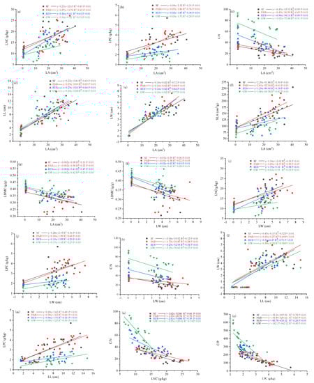 Some samples were dried at 70 °C until constant weight and then grounded and passed through a 100 mesh sieve to analyze elements [45]. LCC, LNC, and LPC were measured using the potassium dichromate method, modified Kjeldahl method, and molybdenum anticolorimetric method, respectively [1,46].