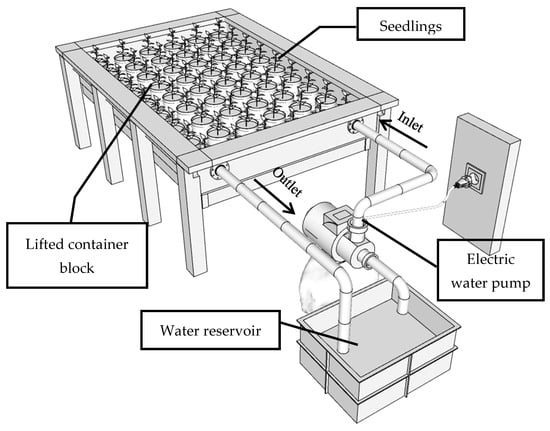Equipment for propagation of Avicennia marina (Forssk.) Vierh. with varying media and salinity, showing the mechanism of water circulation in a container block of each salinity type using an electric water pump and inlet–outlet pipes.