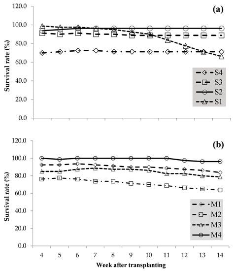Survival rate of Avicennia marina (Forssk.) Vierh. seedlings in a controlled environment: (a) salinity (S) and (b) medium composition (M). (S1: salinity < 5 ppt, S2: 5–15 ppt, S3: 15–25 ppt, and S4: 25–35 ppt; M1: original sedimentary soil and sand (100:0), M2: 50:50, M3: 25:75, and M4: 0:100).