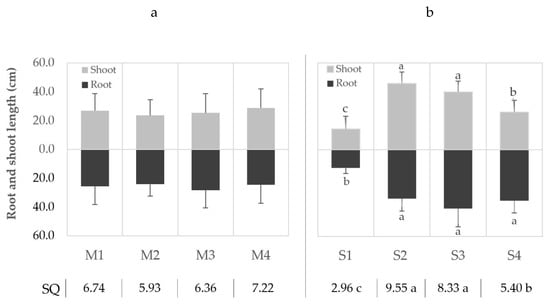Effect of (a) medium (M) and (b) salinity (S) on the root and shoot length, as well as sturdiness quotient (SQ), of 14 week old Avicennia marina (Forssk.) Vierh. seedlings. Different letters above and below the bars indicate significant differences between treatments at α = 0.05. Note: S1: salinity < 5 ppt, S2: 5–15 ppt, S3: 15–25 ppt, and S4: 25–35 ppt; M1: original sedimentary soil (100:0), M2: original sedimentary soil + sand (50:50), M3: original sedimentary soil + sand (25:75), and M4: sandy soil).