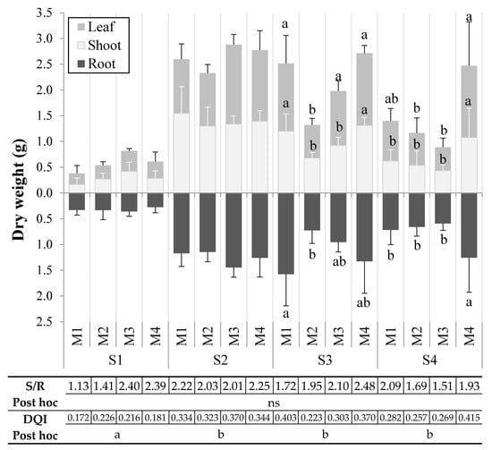 The effect of salinity (S) and medium (M) on the partition of roots, shoots, and leaf biomass of 14 week old Avicennia marina (Forssk.) Vierh., with additional information regarding S/R values and DQI of each treatment at the bottom. No significant differences (ns) at α 95% were observed between and among treatments for the S/R. Different letters under the DQI values indicate a significant difference at α = 0.05 between salinity treatments, whereas no significant differences were noted between medium compositions within the salinity ranges (ANOVA test in Table 4). Note: S1: salinity < 5 ppt, S2: 5–15 ppt, S3: 15–25 ppt, and S4: 25–35 ppt;.M1: original sedimentary soil + sand (100:0), M2: original sedimentary soil + sand (50:50), M3: original sedimentary soil + sand (25:75), and M4: sandy soil (0:100).