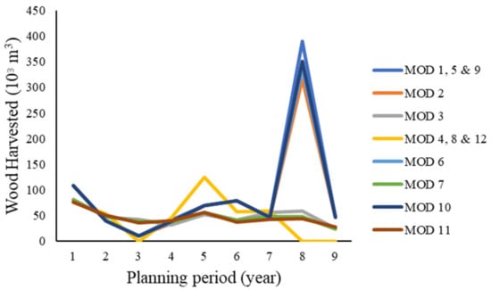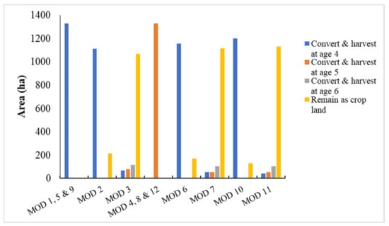 One might expect a lower volume of ending inventory in the case of scenarios with constraints on water use as a lower amount of land is converted to Eucalyptus. The result, however, is the opposite—the volume of the inventory at the end of the planning horizon increased by 42%, 50% and 52% in models MOD 3, 11 and 7, respectively, when compared to the value in the unconstrained LEV maximization scenarios (6.19 × 104 m3). The reason for this can better be understood when we see the optimal land conversion/harvesting prescriptions (i.e., convert and harvest at an age of 4, 5 and 6 years) of the model’s solution (Figure 5). The results show that a lower harvesting age (four years) was the optimal prescription in the unconstrained LEV maximization scenarios (MOD 1, 5 and 9) as well as in the case of scenarios with constraints on crop production (MOD 2, 6 and 10). In all these scenarios, the converted crop land was assigned to be managed under a four-year rotation age.