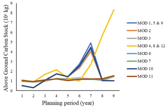 The crop production scenarios affect other outcomes, namely, when they include a constraint of water use (MOD 3, 7 and 11) (Table 2). For instance, the highest wood volume amount was in the ‘low’ crop production scenario model, MOD 3 (4.34 × 105 m3), whereas the lowest was in the ‘normal’ production scenario model, MOD 11 (4.1 × 105 m3). The reverse was found when the scenarios were compared for LEV and total crop production, with the highest being in MOD 11 (4.46 × 109 ETB and 26.2 × 106 kg) and the lowest in MOD 3 (4.36 × 109 ETB and 10.35 × 106 kg). The land conversion/allocation results show that the amount of crop land to be converted into Eucalyptus was relatively higher in the case of MOD 3 (261 ha) than in the case of MOD 7 (210 ha) and MOD 11 (197 ha) (Table 3). No additional cropland can be converted into Eucalyptus while ensuring that the water use does not exceed the amount available from rainfall. These decision scenarios limit the annual water use, while also contributing to a more even flow of wood and a more even carbon stock compared with the other scenarios (Figure 2, Figure 3 and Figure 4).