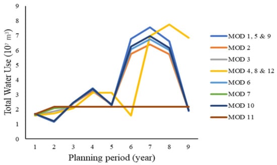 Nevertheless, the land allocations in these scenarios lead to average annual water use values of 3.41, 3.53 and 3.6 × 107 m3 in MOD 2, 6 and 10, respectively. These are lower than the values associated with the unconstrained scenarios, yet they are higher than the case study area’s total annual water available from rainfall, 2.18 × 107 m3.