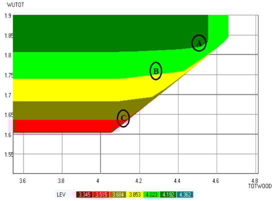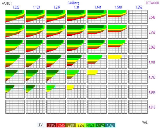 By keeping the value of the crop production criteria at this minimum value, a five-dimensional decision map depicting the tradeoffs among the other five criteria was produced (Figure 6). The overall information from the map is that maximizing carbon stock and/or VolEI would come at the cost of reduced harvested wood volume or LEV and increased total water use. The results showed that the amount of carbon stock can be increased from the minimum value of 1.03 × 107 kg up to a maximum of 1.34 × 107 kg, although ensuring an increase in harvested wood volume from its minimum value of 3.55 × 105 m3 to a maximum value of 4.60 × 105 m3 (Figure 6). However, in order to increase the maximum value of carbon stock from 1.34 × 107 to 1.44 × 107 kg, the maximum harvested wood volume should be decreased from 4.60 × 105 to 4.39 × 105 m3. For a further increase in the maximum value of carbon stock up to 1.55 × 107 kg, there should be an equivalent reduction in the maximum harvested wood volume from 4.39 × 105 to 4.18 × 105 m3. In other words, the maximum carbon stock would decrease from 1.55 × 107 to 1.34 × 107 kg if it was necessary to increase the maximum harvested wood volume from 4.18 to 4.60 × 105 m3 (Figure 6).