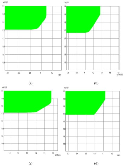 Similarly to the results discussed previously, total water use was increased with an increase in LEV, harvested wood volume, carbon stock and ending inventory criteria (Figure 8a–d). According to the result, starting from an LEV value of 3.8 × 109 ETB, an increase in LEV increased the total water use. For instance, a change in LEV from 3.832 × 109 to 3.934 × 109 ETB (2.62%) results in a corresponding increase in total water use from 1.756 × 108 to 1.763 × 108 m3 (0.38%) (Figure 8a). On the other hand, a change in LEV from 4.063 × 109 to 4.086 × 109 ETB (0.54%) is reflected in an increase in total water use from 1.819 × 108 to 1.844 × 108 m3 (1.37%). Likewise, a 2.04% increase in the amount of harvested wood, from 4.00 × 105 to 4.083 × 105 m3, led to a 0.34% increase in total water use, from 1.735 × 108 to 1.741 × 108 m3, whereas a 1.95% increase in harvested wood, from 4.083 × 105 to 4.164 × 105 m3, led to a 1.58% increase in total water use, from 1.741 × 108 to 1.769 × 108 m3 (Figure 8b).