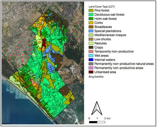 Oak forests and mixed deciduous broad-leaved woods predominate, occupying 23.6 km2 (40% of the woods), a surface higher than the evergreen oaks, and are represented by holm oaks (4.3 km2) and cork oaks (2.4 km2), by pine forests (9.1 km2) and by Mediterranean maquis favored by anthropic land use changes in past centuries [40]. The most significant aspect that makes Castelporziano a territory now unique in the Mediterranean Basin is given by the presence of a specific and therefore very high genetic biodiversity, with 5037 species recorded, representing an exceptional wealth of flora and fauna on an area of just 60 square kilometers [41], (Figure 1).