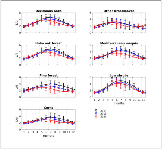 A general change in phenology was observed, in 2020 compared to 2014, with an anticipated peak in LAI that shifted from June to July in 2014 to May to June 2020 (Figure 3). This is in line with previous findings showing that key Mediterranean species such as Quercus ilex display a longer period of growth by approximately 10 days by advancing the onset of spring by winter warming, with an early cessation of growth in spring and summer [77].