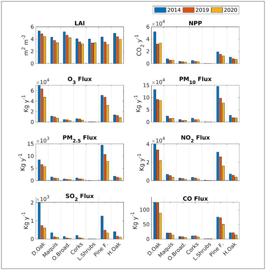 Intercomparison of the three years of study for each of the six Land Cover Types (Deciduous oaks, Mediterranean maquis, Other broadleaves, Corks, Low shrubs, Pine forest, Holm oak forest) used in this study. LAI (leaf area/ground area, m2 m−2), Net Primary Productivity (NPP, kg of CO2 y−1), deposition of ozone (kg O3 y−1 ), particulate matter (kg PM2.5 y−1 and kg PM10 y−1), Nitrogen dioxide (kg NO2 y−1), Sulphur dioxide (kg SO2 y−1) and Carbon monoxide (kg CO y−1) estimated by the AIRTREE model are shown in the bar charts. Values represents cumulated values of uptake and deposition of pollutants for each LCT.