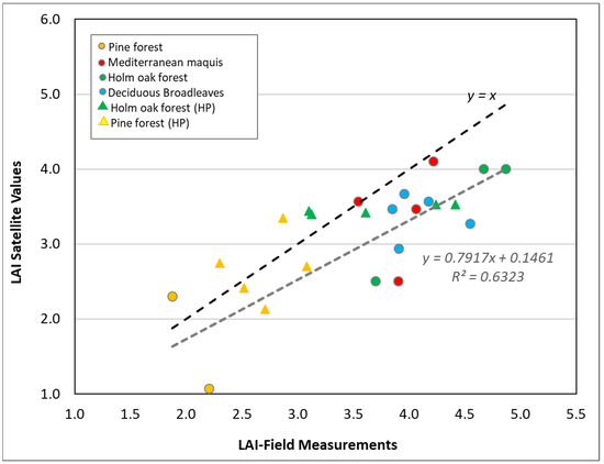 Satellite LAI values used in this study were compared with field measurements with an overestimation of 20% considering all LCTs (Figure 4). Deciduous broadleaves and Holm oak forests showed the highest LAI values (4.12 and 4.41, respectively; statistics are shown in Table S2), in accordance with what was previously found for Deciduous oaks stands [78]. We measured lower LAI values for Pine forests and Mediterranean maquis (2.08 and 3.85, respectively), in line with previous findings [79,80].