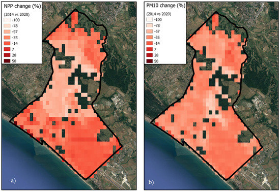 Percent changes (%) in (a) NPP (kg CO2 y−1) and (b) PM10 deposition (kg PM y−1) estimated by the AIRTREE model between 2014 and 2020. The vividness of the pixels (from dark red to white) indicates the increased or decreased sequestration capacity of the Estate, while empty (transparent) pixels represent non-natural LCT not considered in this study.