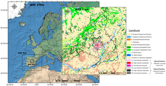Surface properties in a mesoscale meteorological model, such as WRF, are represented by average biophysical properties of different land uses that govern the exchange of heat and momentum between the atmosphere and the ground. Current land uses were taken from the Corine land cover (CLC 2012) and mapped to USGS classes. The details of this procedure can be found elsewhere [53]. These include natural and urban classes, where built up areas are significant. In the second case, grid cells may include some vegetation too and their influence on such properties needs to be considered as well. The part of the modelling system that solves the interactions between the atmosphere and the ground depending on the land-use type (Figure 1) is the land-surface model (LSM), a particularly important feature for this study. We relied on the Noah land-surface model (LSM) [64], which has been identified as the best-performing option for our modelling domain in previous studies [52,53]. However, the Monin–Obukhov similarity theory (MOST) behind LSM in mesoscale models does not hold on urban areas, so the multilayer urban parameterization BEP was applied for our simulations in D4. This urban canopy parameterization considers 3 urban land use classes: ‘Low Intensity Residential’, LIR (31), ‘High Intensity Residential’, HIR (32) and ‘Commercial & Industrial’, C&I (33). The user of the standard model defines an average urban fraction, UF (ranging from 0 to 1), for each of these categories, representing the fraction of the surface covered by artificial materials (buildings, roads and sidewalks). In the present study, we assigned UF for each grid cell using the variable FRC_URB2D. The remaining area (1-UF) within urban grid cells is addressed as natural fraction and assigned the same physical properties (those of ‘Cropland/grassland mosaic’, default land-use type). Using a single land use to represent the non-urban fractions in built areas is a strong simplification, since important properties such as leaf area index (LAI), albedo, canopy height or roughness length may vary largely depending on the actual vegetation in different grid cells within the city.