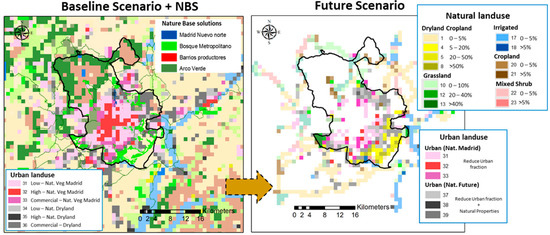 We built a Future Scenario that intends to represent all the relevant interventions envisaged in urban plans and strategies for Madrid in the next decades (Figure 2). The 4 major naturalization measures included in this scenario are as follows: