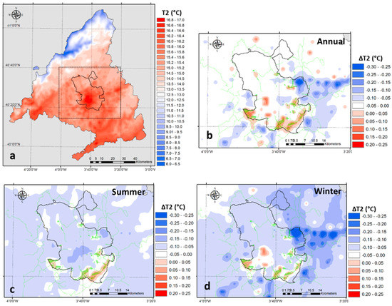 Figure 4a presents the annual mean temperature at ground level (T2) for the Baseline Scenario. This image clearly shows the heat-island effect of Madrid city in the center of the modeling domain. Topography also plays an important role, explaining the large temperature differences between the northern limit of the Madrid Region (6–10 °C) that corresponds to the ‘Sierra de Guadarrama’ mountain range (2000–2400 m height above sea level) and the southern part of the modeling domain, with annual mean temperatures up to 17 °C in the ‘Tajuña’ and ‘Henares’ valleys. Figure 4b–d show the difference between the Future Scenario and the Baseline Scenario for T2 as an annual mean as well as the summer and winter mean, respectively. Positive values (>0), represented in red, correspond to increments, while negative values (in blue) indicate a decrease induced by future NBS (represented in light green). In all three figures, we observe positive values in the close vicinity of interventions. Of note, the introduction of trees in barren areas brings about air temperature increases up to 0.20 °C (Table 2) (1%, Figure S1). This increase may be related to augmented sensible-heat (SH) flux in the areas where new trees are included (Figure S2), due to a decrease in albedo and enhanced energy absorption (Figure S3). Overall SH fluxes are considerably higher than latent heat (LH), something typical of relatively dry soils [67,68].
