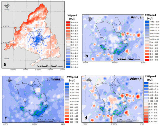 Annual mean wind speed (10 m) for the Baseline Scenario (a). Expected variation in wind intensity: annual mean (b), summer mean (c) and winter mean (d), due to future vegetation.