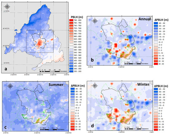Figure 6b shows contrasting results for the annual mean value and strong spatial gradients, from 250 m in the mountain range up to 800 m in downtown Madrid. This is consistent with previous studies that have reported PBLH variation in short spatial scales due to differential heating of different surfaces and land uses [71].