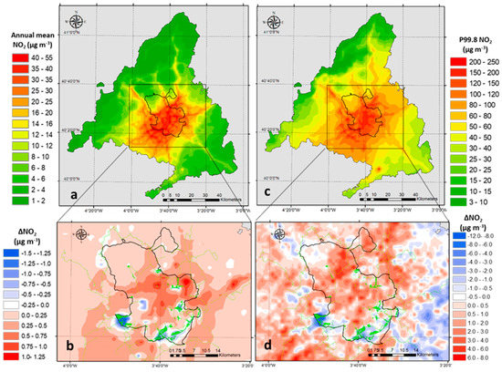 As for NO2 peak values, represented by the hourly percentile 99.8 (19th highest value within the calendar year), the spatial patterns are similar to those of the annual mean in the Baseline Scenario. In this case, we observe maximum values for the NO2 hourly limit value close to 250 µg m−3 (Figure 7c). Future vegetation (Figure 7d) would reduce these peaks in the range of 4–11 µg m−3 (2%–8% according to Figure S6) in the more densely reforested areas of ‘Bosque Metropolitano’. Increments of up to 5 µg m−3 occur in some urban locations, presumably due to a decreased PBLH associated to the vegetation cooling effect within the city. A thinner mixing height may promote the accumulation of pollutants and give rise to slightly higher concentration levels [71,74].