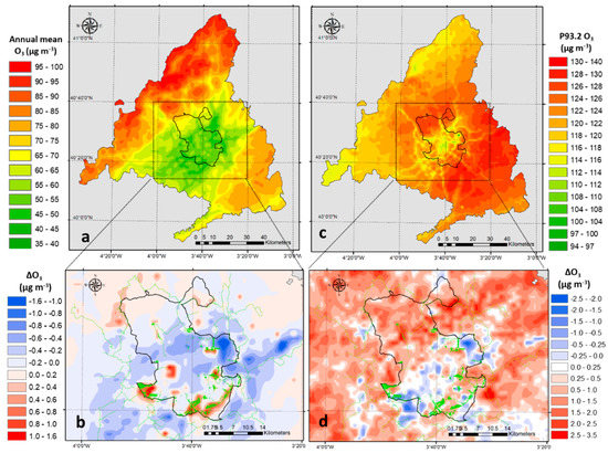 Annual mean of O3 (µg m−3) for the Baseline Scenario (a) and expected variation (µg m−3) due to future vegetation (b). Daily percentile 93.2 of O3 maximum daily eight-hour mean (µg m−3) for the Baseline Scenario (c) and expected variation (µg m−3) due to future vegetation (d).
