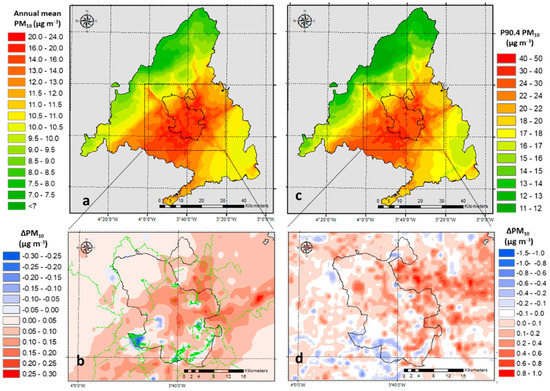 Annual mean of PM10 (µg m−3) for the Baseline Scenario (a) and expected variation (µg m−3) due to future vegetation (b). Daily 90.4 PM10 percentile (µg m−3) for the Baseline Scenario (c) and expected variation (µg m−3) due to future vegetation (d).