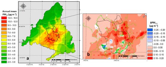 We found very similar results for finer particles (PM2.5). As illustrated in Figure 10, very limited concentration decreases (of slightly higher than 0.2 µg m−3 as an annual mean, approximately 2%) would occur in new wooden areas in the city outskirts. The combined effect of wind reduction and direction modification with reduced mixing height may result in generalized concentration increases in the metropolitan area of the city, if constant emissions are assumed.